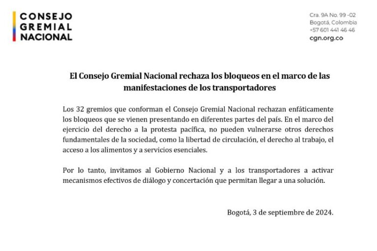 Los 32 gremios que conforman el Consejo Gremial Nacional rechazan enfáticamente los bloqueos que se vienen presentando en diferentes partes del país. En el marco del ejercicio del derecho a la protesta pacífica, no pueden vulnerarse otros derechos fundamentales para la sociedad, como la libertad de circulación, el derecho al trabajo, el acceso a los alimentos y a servicios esenciales.